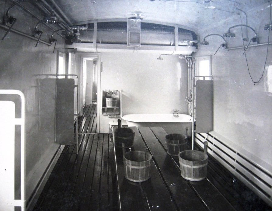 Через утепленный тамбур можно было пройти в вагон-парильню и душевую, в ней одновременно могло находиться до 52 человек. Далее боец проходил в вагон, где солдату выдавали дезинфицированную одежду и чистое нательное белье. Там же солдаты могли постричься и сбрить бороды. Последним в составе было клубное помещение. Чистые военные там отдыхали после бани: читали книги и газеты, писали письма домой, играли на музыкальных инструментах и обсуждали последние новости. За час помыться в передвижной бане могли до ста человек.
