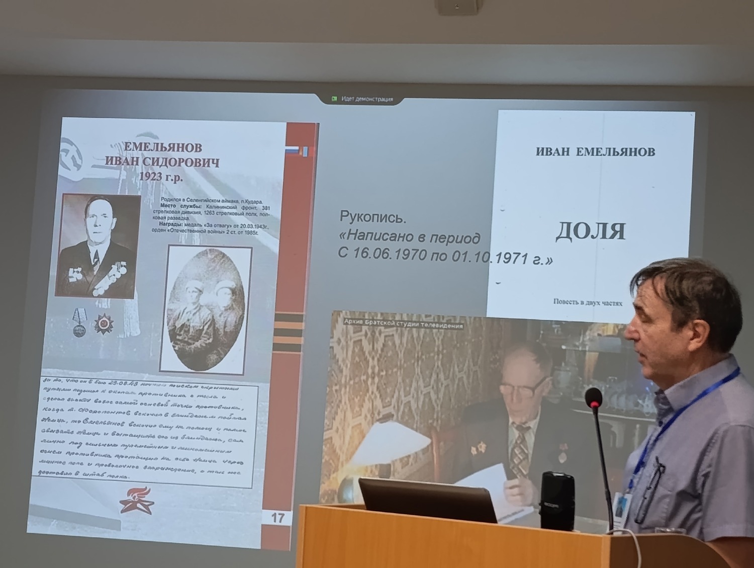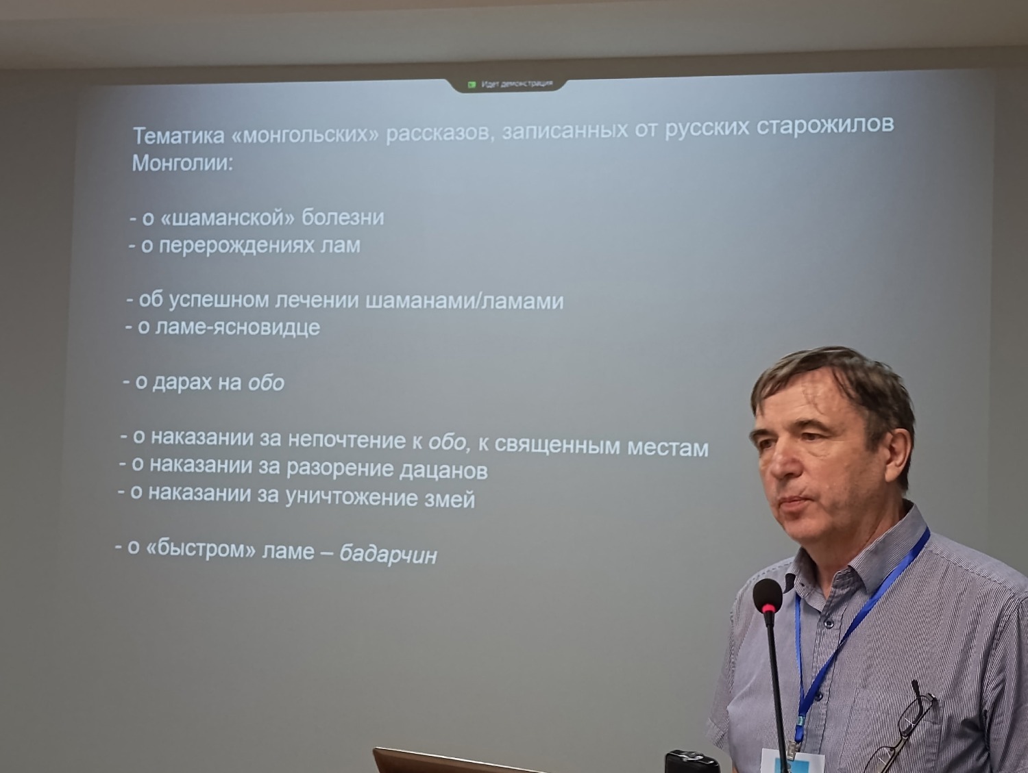 О русских в Монголии, о мифологической прозе русских старожилов. Об их живой фольклорной традиции и билингвизме в русских сюжетах на границе проживания – слушая этот доклад В. Л. Кляуса (где фигурировала рукопись-книга «Доля» И. С. Емельянова, изданная без ISBN, и потому не вошедшая ни в один каталог), я убедилась, как важно правильно оформлять свой труд, дабы он мог получить дорогу к людям... После выступления Владимира Леонидовича Кляуса о живом «фольклоре» русских в Монголии, о шаманах и ламах в этих рассказах, я вдруг начала припоминать рассказы о чудесах неких башкирских «бабу» – святых дервишах, которые жили в 1950–70-е годы, не задумывалась, когда их слышала, что это фольклор и не записала. А теперь пытаюсь вспомнить, но не могу, а жаль...