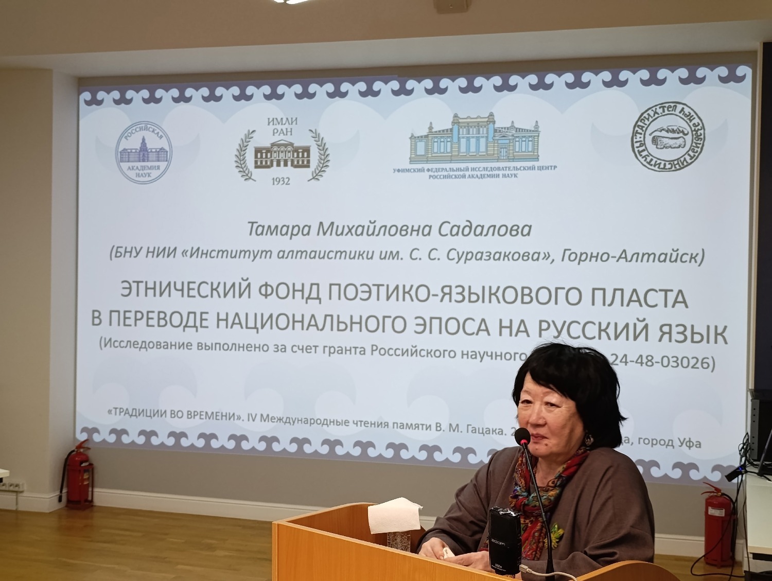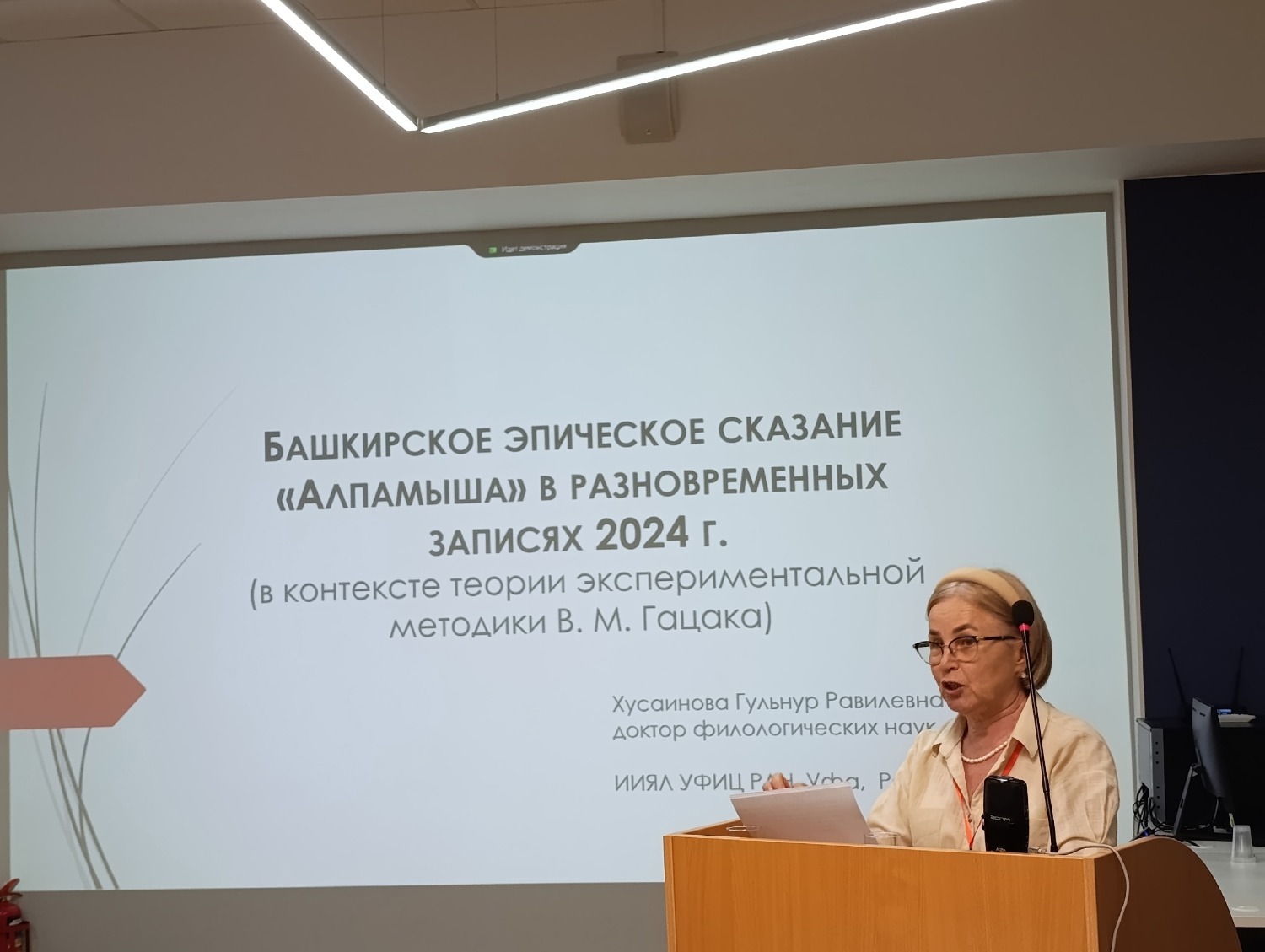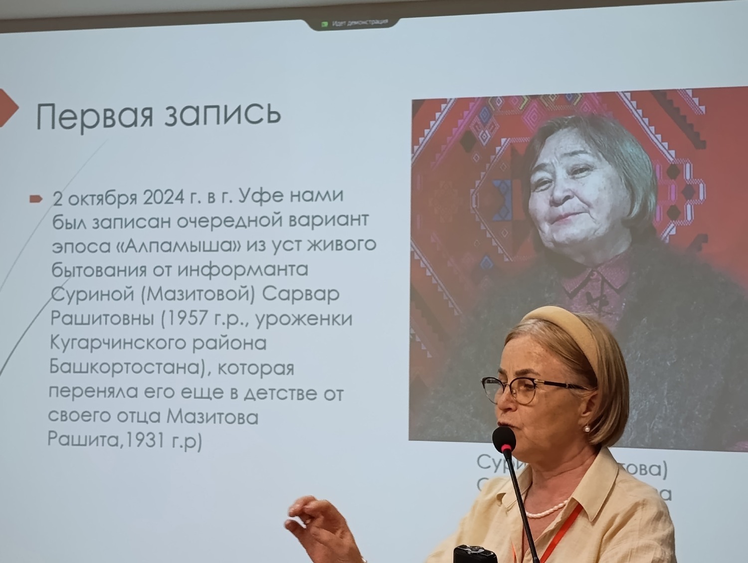 Далее было погружение в современное фольклорное чудо – Хусаинова Гульнур Равиловна (тоже ученица Гацака) очень интересно рассказала о работе с современной наследственной сказительницей башкирского эпоса «Алпамыша». Об особенностях и тонкостях записи эпоса в 2024 году и сравнительных аспектах устных воспроизведений рассказа с разницей в 2 месяца 23 дня. Современная сказительница Сарвар Рашитовна Сурина родилась в 1957 году в Кугарчинском районе и переняла эпос от своего отца 1931 г. р., и он еще жив. Когда она рассказывала «Алпамышу» под запись фольклористам, то упомянула, что последний раз рассказывала этот эпос лет 15 назад примерно, когда её дети были маленькие, и с тех пор ни разу. Представляете, какое упущение – не только её дети должны были слышать этот эпос. Так часто поднимаются вопросы сохранения культурного наследия, а тут живые сказители молчат по полтора десятка лет, вместо того чтобы выступать перед людьми, изучающими свой язык, перед детьми на уроках башкирского языка, хотя бы в специализированных школах, перед студентами факультета башкирского языка вузов и пед. колледжей. Возможно, после этой информации откликнутся ещё сказители, хранящие другие предания в своей памяти и молчащие много лет.