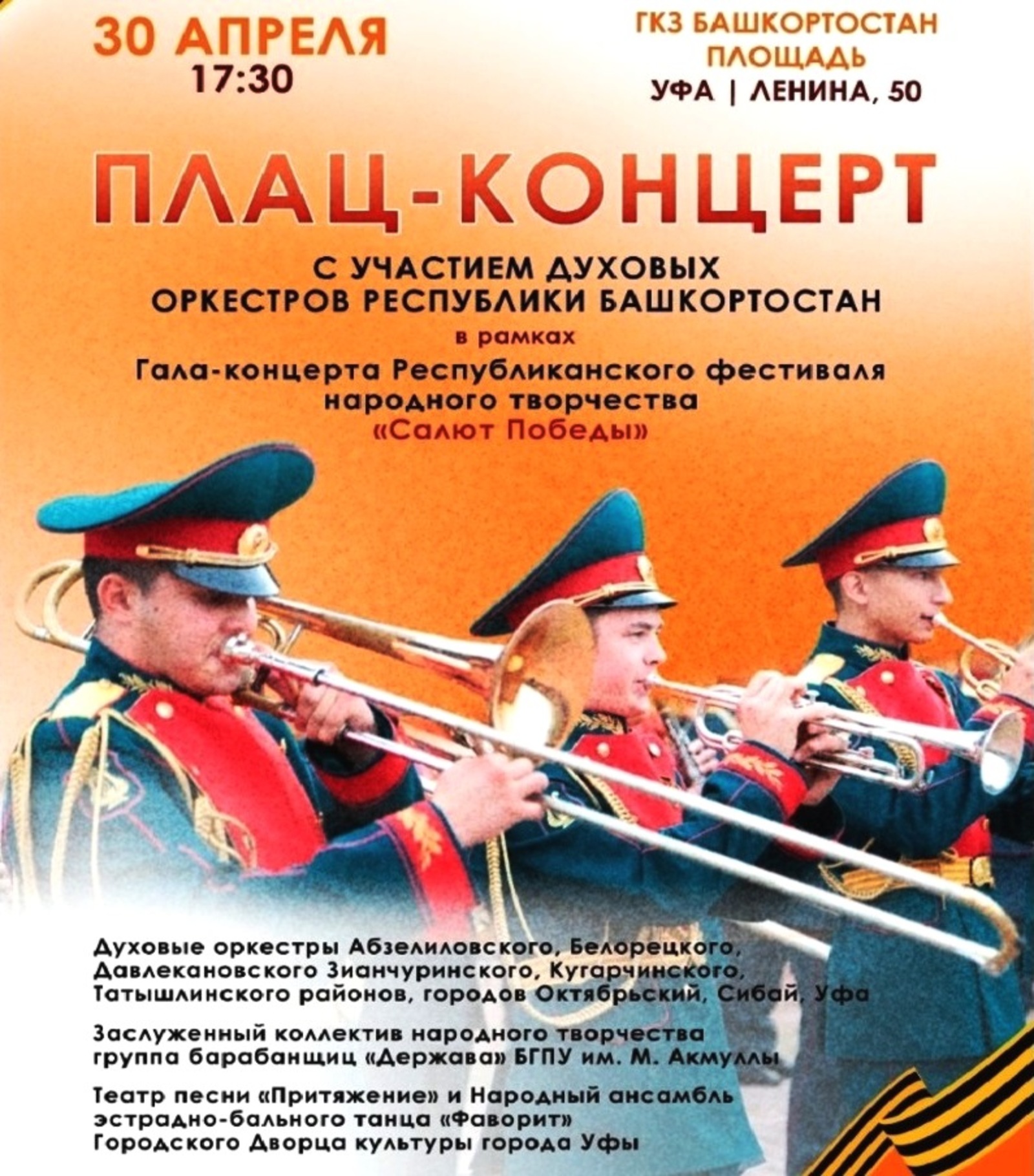 30 апреля в Уфе на площади перед ГКЗ «Башкортостан» состоится плац-концерт духовых оркестров в рамках подведения итогов всероссийского фестиваля «Салют Победы», посвященного 80-летию Победы в Великой Отечественной войне.