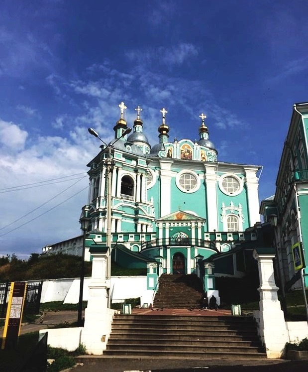 Покатались по городу, прирулили на площадь Победы, тут просто погуляли туда-сюда. «Опалённый цветок» и памятник защитникам Смоленска увидели. Впечатлились. Впрочем, не особо. Съехали с пологой «горки» (видимо, этой «горкой» была центральная и более-менее приличная улица, названия которой я так и не удосужился уточнить*) к подножию Храмов Соборной горы. Бросили машину на «стоянке» (на «прямоугольной» разметке для авто) перед бронзовой статуей Кутузова, стоящей на постаменте из розового мрамора в окружении квадрата живых цветов. И двинулись вверх по соборной лестнице к необыкновенному чуду. Чудо — это Успенский Кафедральный собор, особо не пострадавший ни в период Наполеона, ни в страшный год оккупации Смоленска немцами. Храм, конечно, великолепен изнутри, но снаружи — ещё величественней. Языками от восхищения мы поцокали, но про себя, мысленно.