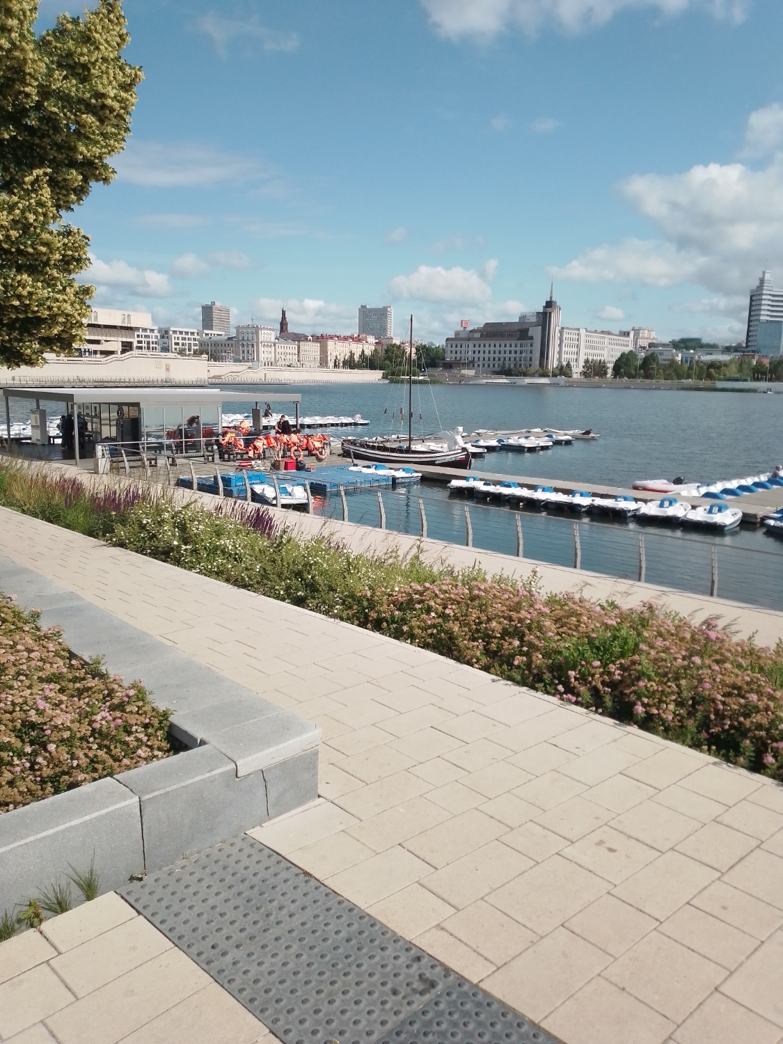 Парк Тысячелетия открыли в 2005 году в честь 1000-летия города. На этом месте раньше была старая застройка, а не лес. Поэтому молодые деревья только-только заполняют аллеи. Можно пройти через ближний вход со стороны озера, дойти до центрального фонтана, сделать несколько фото, выйти в следующие ворота со стороны озера и продолжить прогулку по набережной.