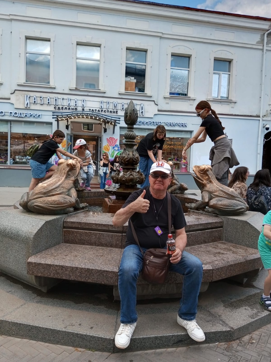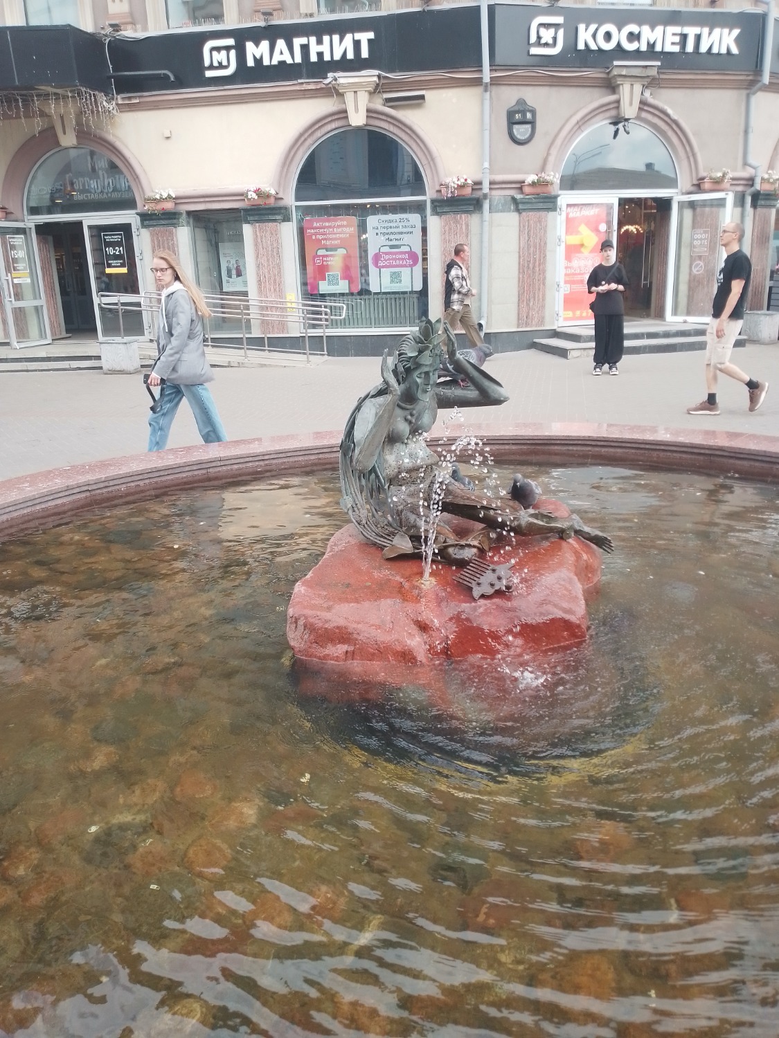 Далее на главной туристической тропе Казани находится фонтан со скульптурной композицией «Голуби». Привлекает внимание тем, что наряду с металлическими собратьями, здесь могут утолить жажду и настоящие птицы – символы мира и добра. Неподалеку расположены не менее популярные фонтаны с лягушками и русалкой. Впрочем, не совсем русалкой. Правильное название фонтана «Су анасы» (водяная мать) – дух воды, существо женского пола, примерно то же, что в русских сказках русалка. Атрибутами водяной девы считаются золотые ведра и золотая гребенка.
