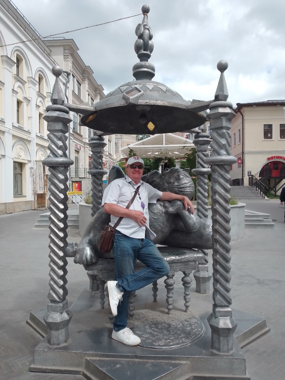 А вот и главная достопримечательность «бауманки» – памятник Казанскому коту – скульптурная композиция расположена под балдахином на пересечении улиц Баумана и Мусы Джалиля. Вальяжный, упитанный котик, да какой там котик – котище, с большим животом – символ города и излюбленный персонаж местных легенд.