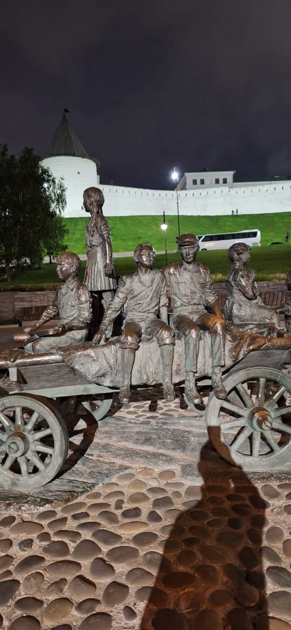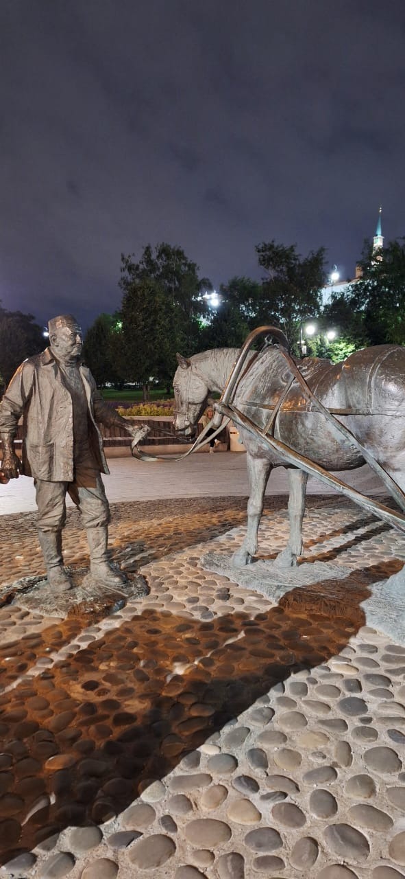 Необычную скульптурную композицию мы наблюдали у стен Казанского кремля на площади Тысячелетия: пожилой извозчик в простой деревенской одежде ведет запряженную в телегу лошадь, а на телеге сидят ребятишки. Оказалось, что прообраз этого героя композиции — вполне реальный человек. Что же он такого совершил, что ему при жизни поставили памятник, неужели только за то, что он катал детей на своей телеге?