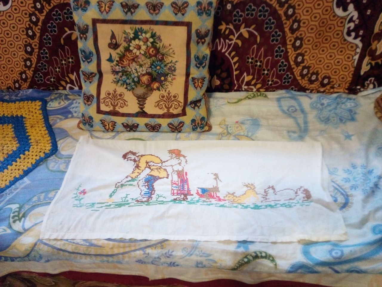 Наша героиня — творческий человек и весьма талантлива. В свободное время она занималась вышиванием. Валентина Александровна скромно показала вышивки крестиком и гладью. Уже и не странно, что такое замечательное занятие, являясь одним из проявлений умений прикладного характера, которым девочки обучались сызмальства, может служить лишним аргументом в пользу создания картины исторического быта нашего народа.