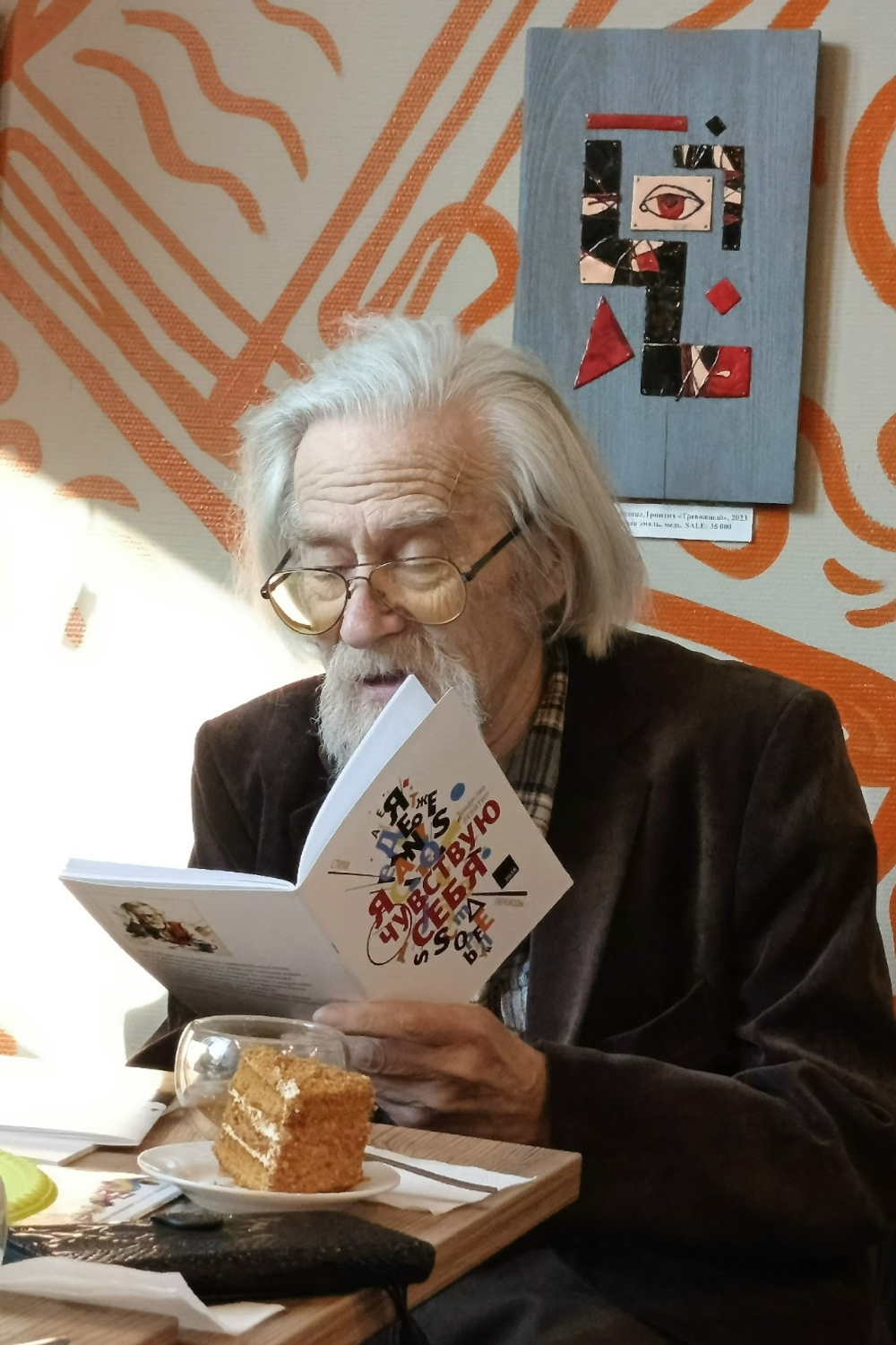 Он как-то вдруг появился в дверях картинной галереи на Достоевского, занял место во главе стола. Седовласый, с бородой, в коричневом пиджаке поверх клетчатой рубашки. Большие очки с озорными желтыми стеклами. Слегка настороженный, притом собранный, деловитый. В следующий миг в центре стола, по соседству с чашками, чак-чаком и тортом, как по мановению руки волшебника, появились аккуратные стопки сборников стихов и переводов, изданных в «Прокопии». Сборники привычного А5 размера, а еще элегантные карманные книжки. И все оформлены под стать автору — коллажи, игра с буквами, асимметрия, портрет автора и некое око, следящее за читателем.