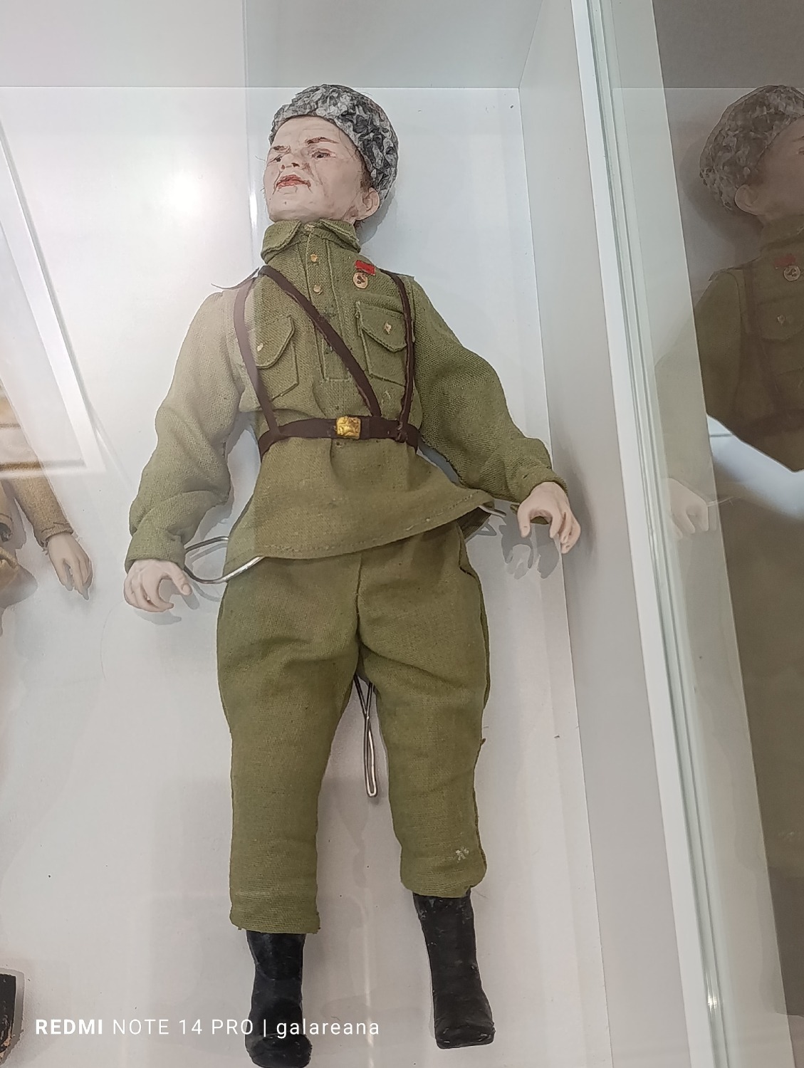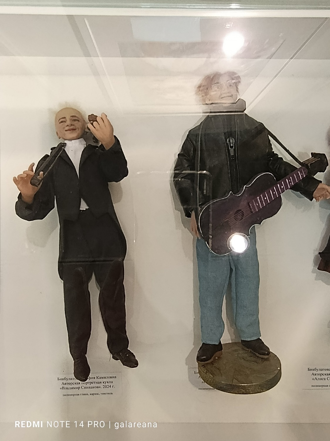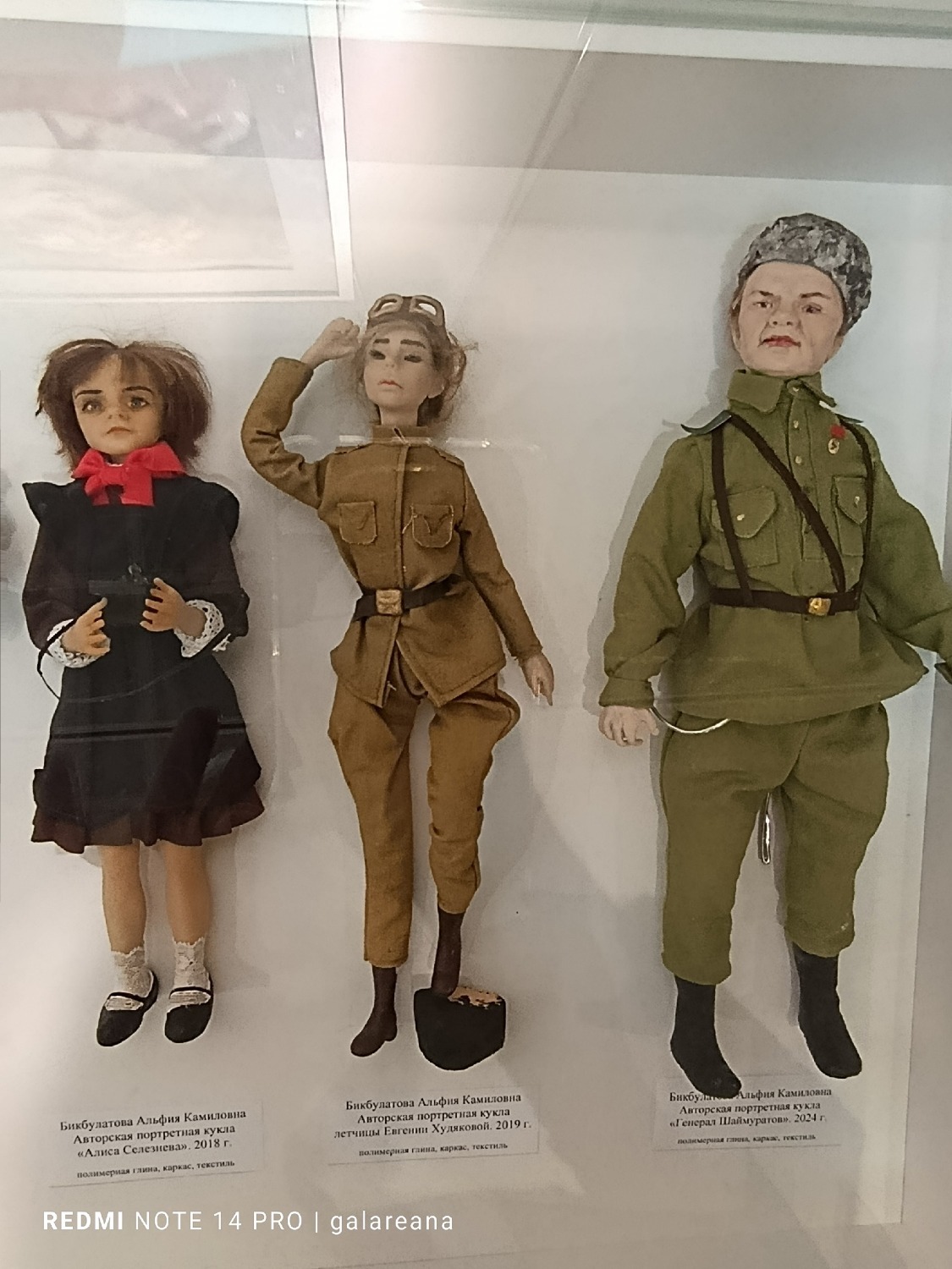 В отдельной витрине куклы, знакомые мне по другим выставкам, – Спиваков и Джон Леннон (опять поражаюсь ухваченной характерности – это волшебство, заколдованные люди, а не куклы), Алиса Селезнева из старого советского фильма «Гостья из будущего» (интересно, а смотрела ли художница новый фильм). Среди кукол тоже появилась воинская тема – летчица Худякова и Шаймуратов-генерал.