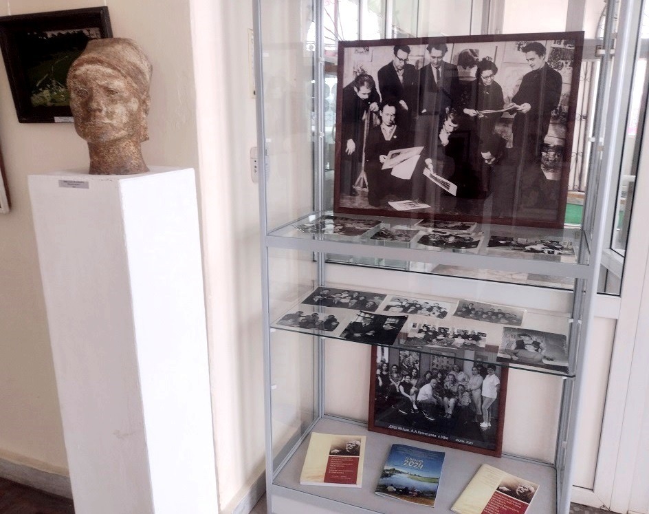 Открывают экспозицию произведения старейших преподавателей школы. Среди них, заслуженный работник культуры РБ Виктор Андреевич Голов (1925–1997). Долгие годы, активно совмещая административную работу с преподавательской деятельностью, он делился творческим опытом со своими учениками. Его небольшие по формату тонкие, лирические этюды, исполненные в лёгкой импрессионистической манере, запечатлели сиюминутное мгновение тёплого розового заката, окутавшего старый город, с его прохладным речным портом и белокаменными соборами, ностальгическую красоту уютных уфимских двориков, с прогуливающимися горожанами («Летний день», «Полдень», «Старая Уфа», «Во дворе»).