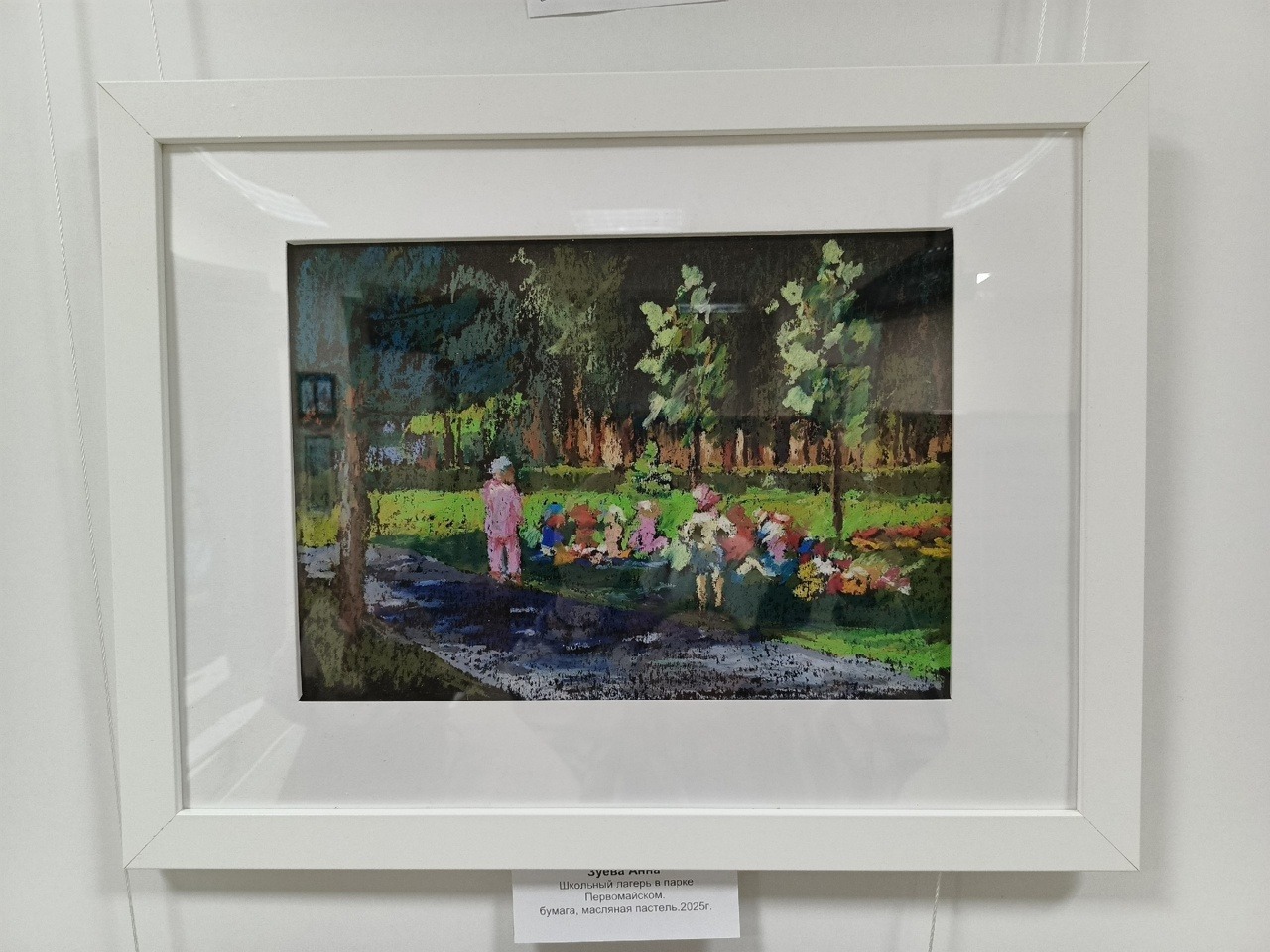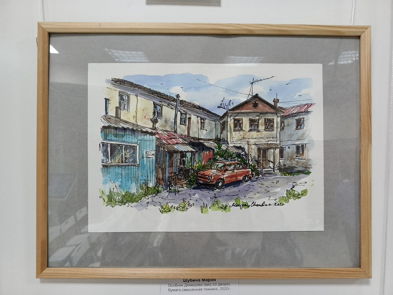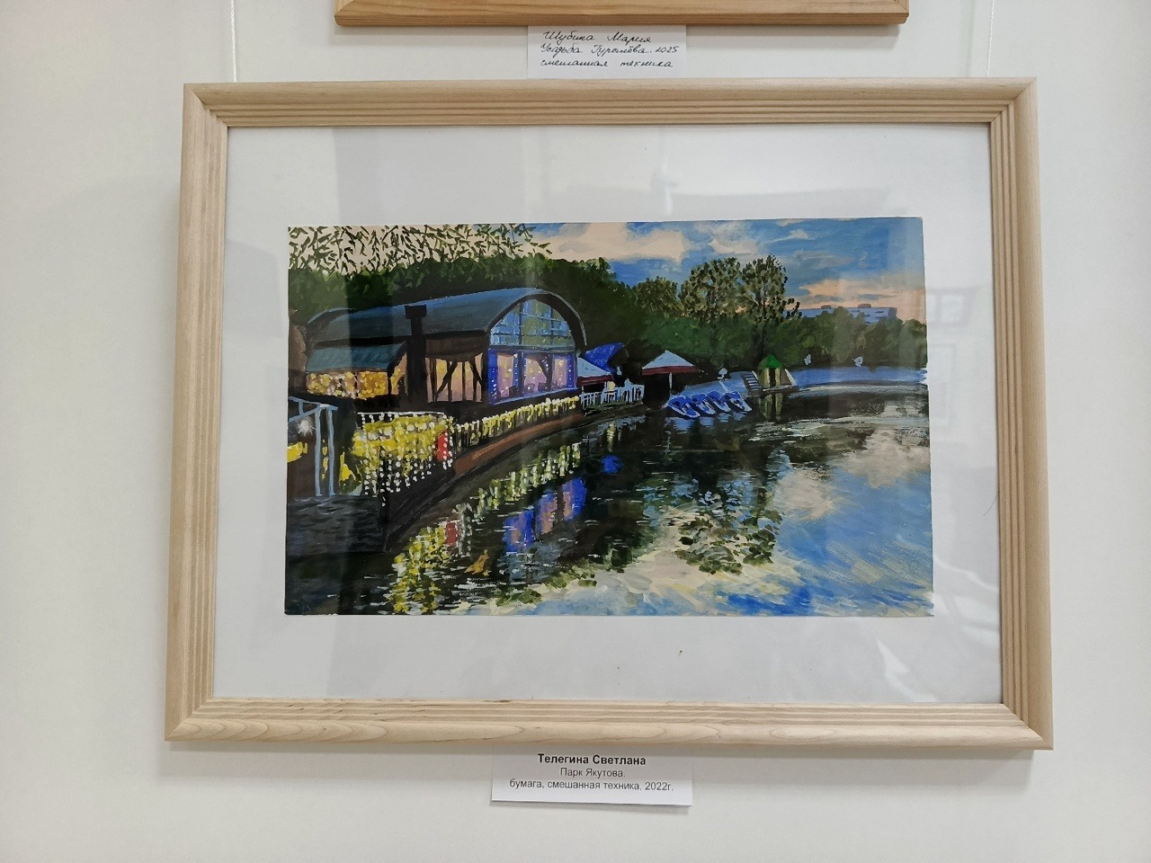 А я еще раз неторопливо посмотрела на скетчи: потрясающий «Особняк Демидова» и «Усадьбу Гурылёва» в исполнении Марии Шубиной. «Ворота дома-музея Тюлькина» Ольги Курамшиной. «Парк Якутова» Светланы Телегиной — работа датирована 2022 годом: в красивой вечерней зарисовке кафе у пристани еще работает, там уютно, тепло и на это приятно смотреть. Вот «Дом профсоюзов» и «Восьмиэтажка» Риды Саетгараевой (2018 год и совершенно другие виды на привычные здания!). А вот силуэты детей — «Школьный лагерь в парке Первомайском» в замечательной масляной пастели Анны Зуевой.