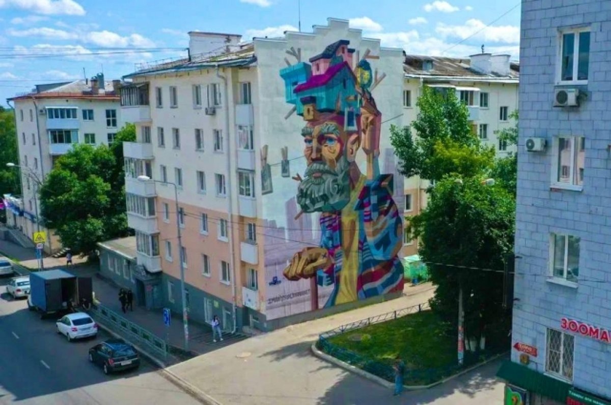 Вернемся к Уфе. Одной из первых и символически насыщенных работ фестиваля стал мурал «Идель», украсивший торец здания Уфимского университета науки и технологий по ул. Карла Маркса, 12/5. Художественное произведение визуализирует древнюю башкирскую легенду о встрече двух рек — Агидели и Караидели, чье слияние определило географическую идентичность Уфы.