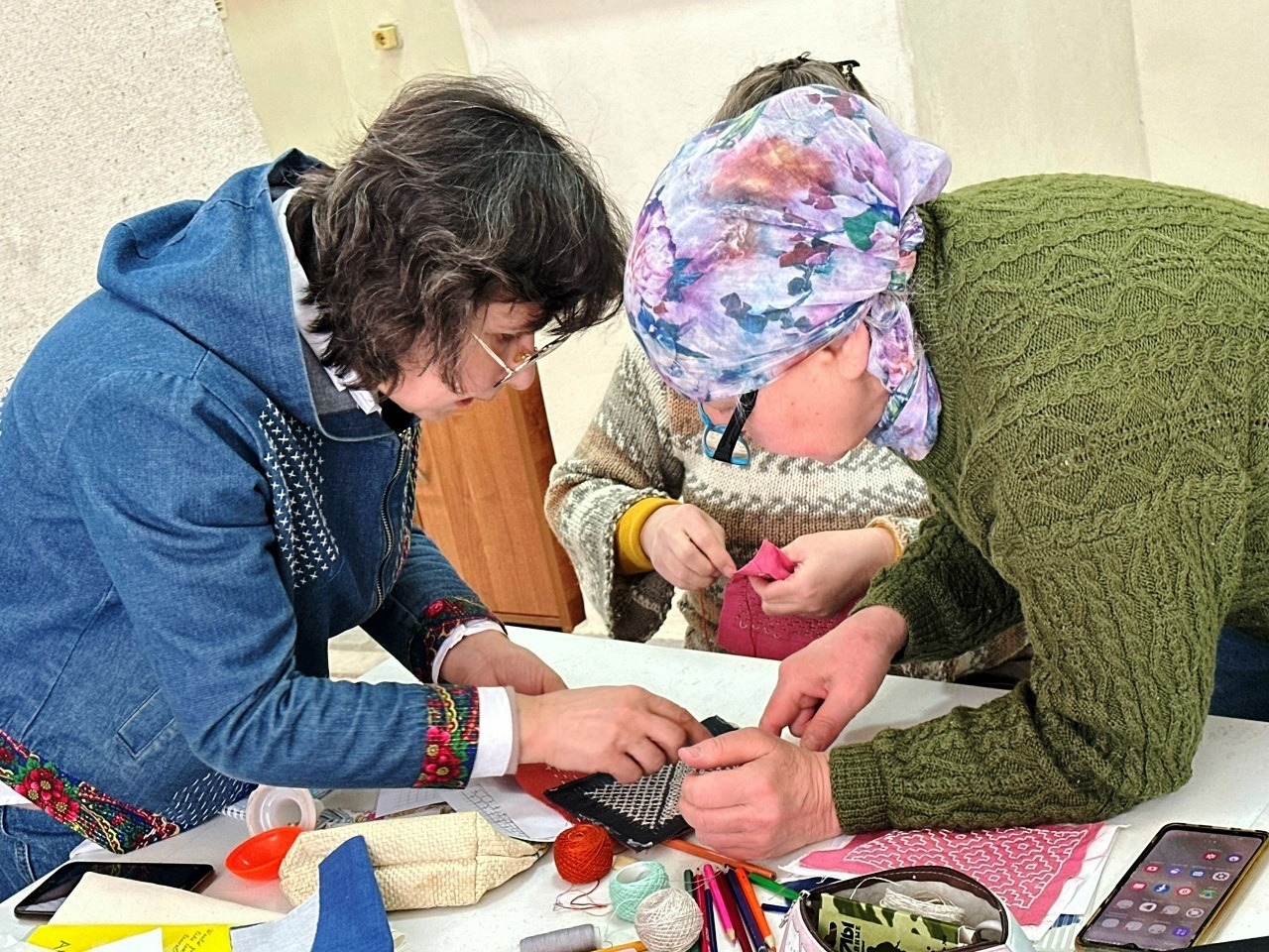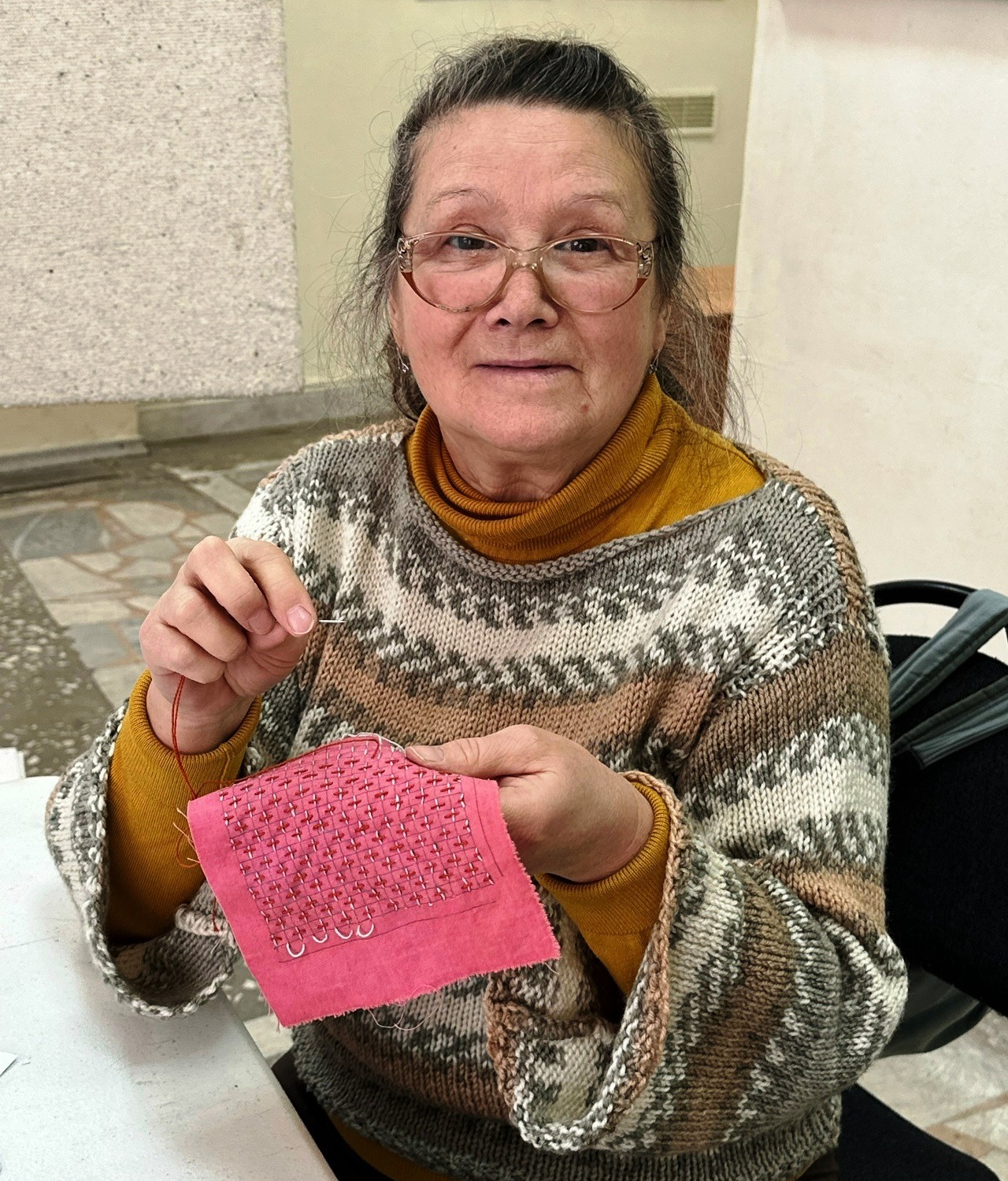 Участники мастер-класса работали с толстой хлопковой нитью и длинной иглой. Создали свой мини-проект: вышитый фрагмент на хлопковой ткани, который затем смогут применить как декоративный аксессуар, салфетку, панно или оформят заплатку на каком-либо изделии одежды.