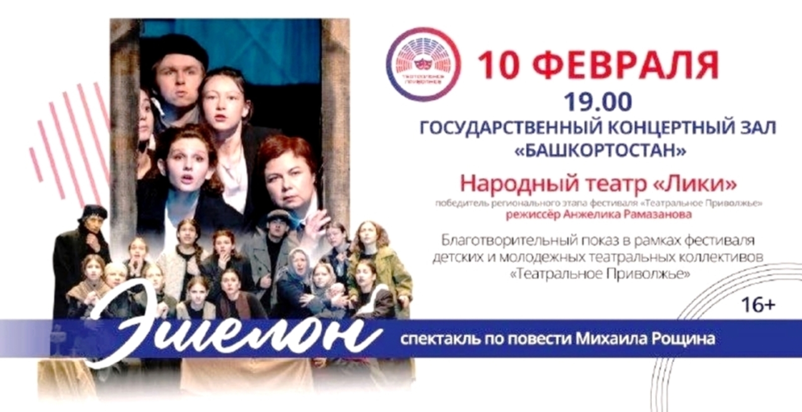 10 февраля в Уфе победитель регионального этапа фестиваля «Театральное Приволжье» среди молодежных коллективов — театр «Лики» концертного зала «Башкортостан» выступит с благотворительным показом спектакля по повести Михаила Рощина «Эшелон» (16+).