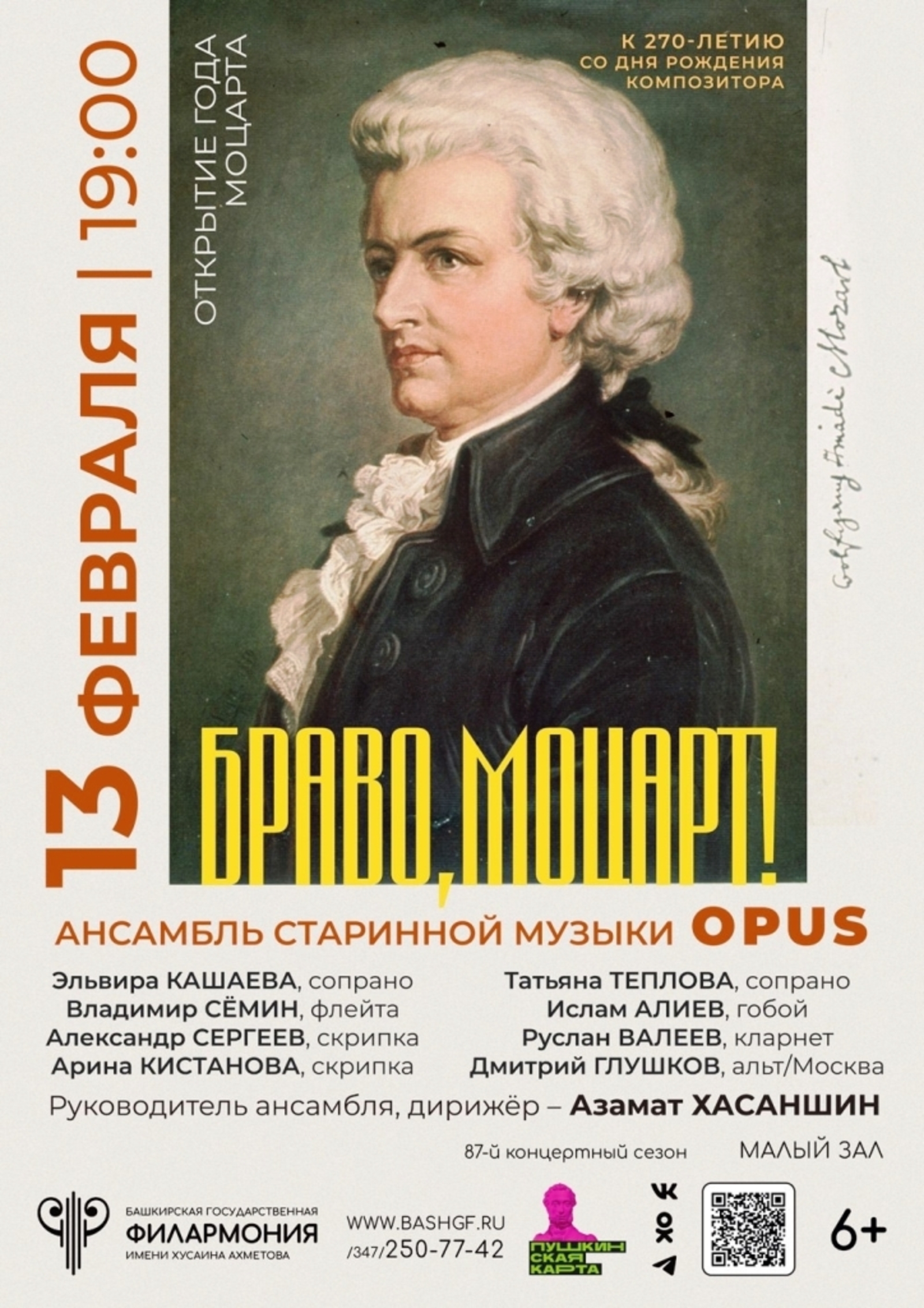 Концертом тринадцатого февраля в пятницу в малом зале филармонии открывается Год Моцарта в нашей республике.
