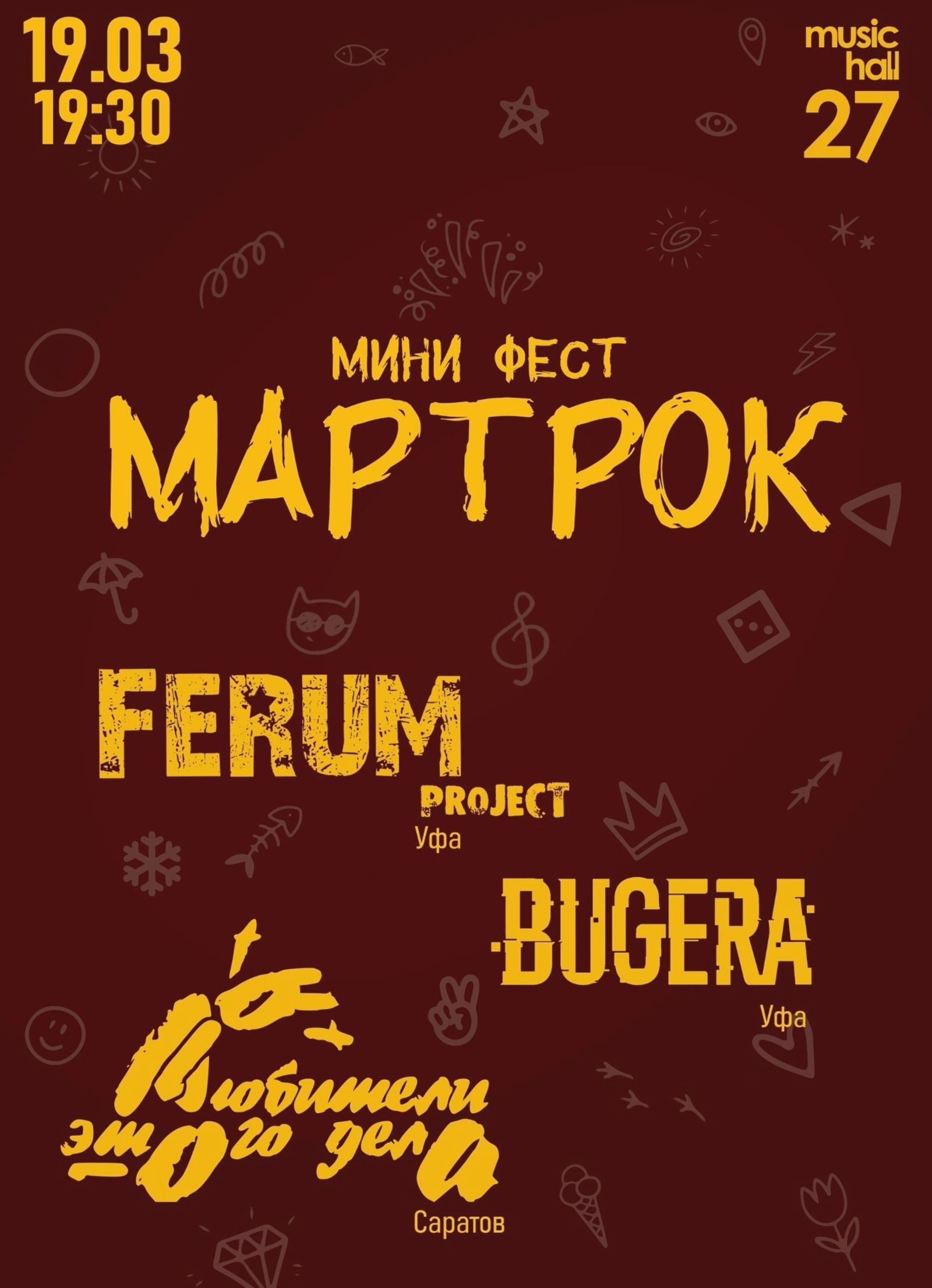 Собираемся в Уфе на классной площадке MusicHall27. Мы любим разноплановость в жанрах и в этот раз приготовили весенний коктейль из трёх классных групп с авторской музыкой.