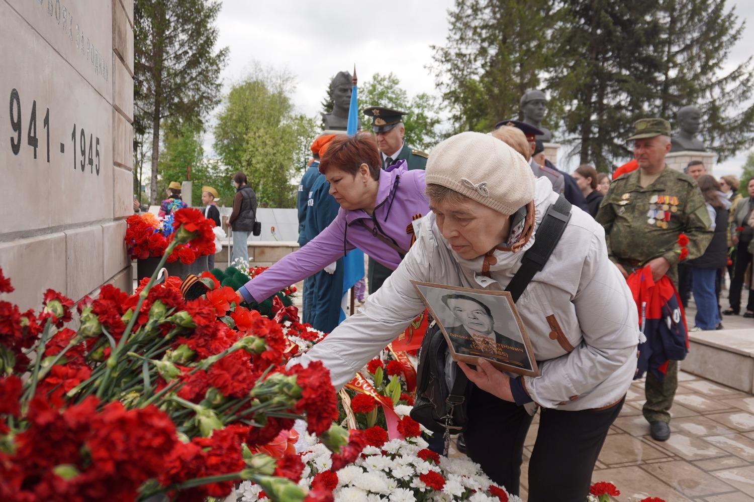 День Великой Победы для всех жителей города продолжился у мемориала памяти воинам-землякам, погибшим в годы Великой Отечественной войны 1941–1945 годов. Сюда люди приходят семьями с портретами своих родственников и цветами, которые они возлагают к монументу.