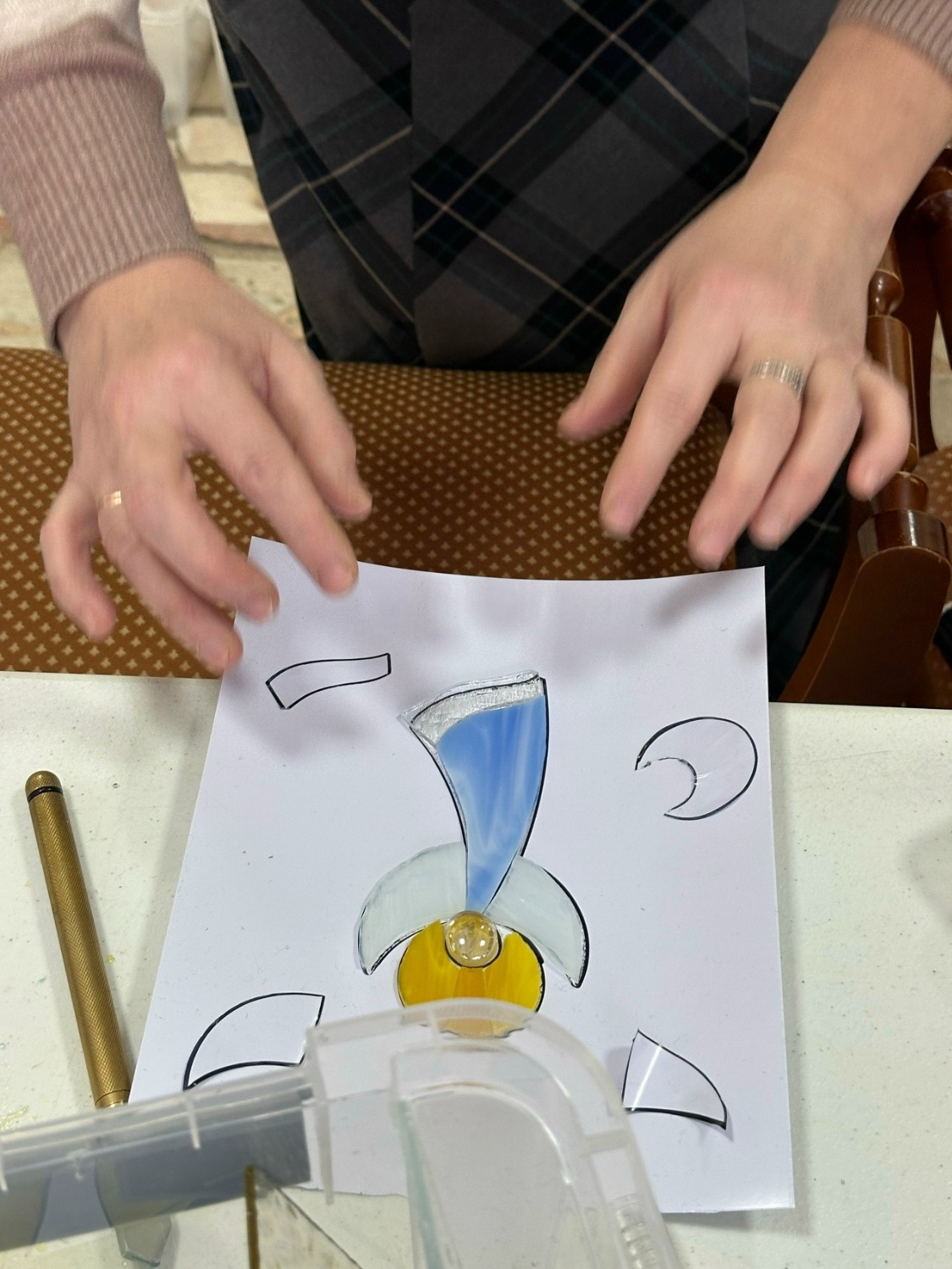 В завершение занятия, в технике фьюзинг был показан процесс спекания стекла при высокой температуре, позволяющий создать переходы цвета, текстуры и даже объёмный эффект. Техника фьюзинг, в которой работали участники, уникальна: она позволяет придать изделию воздушный объёмный эффект.