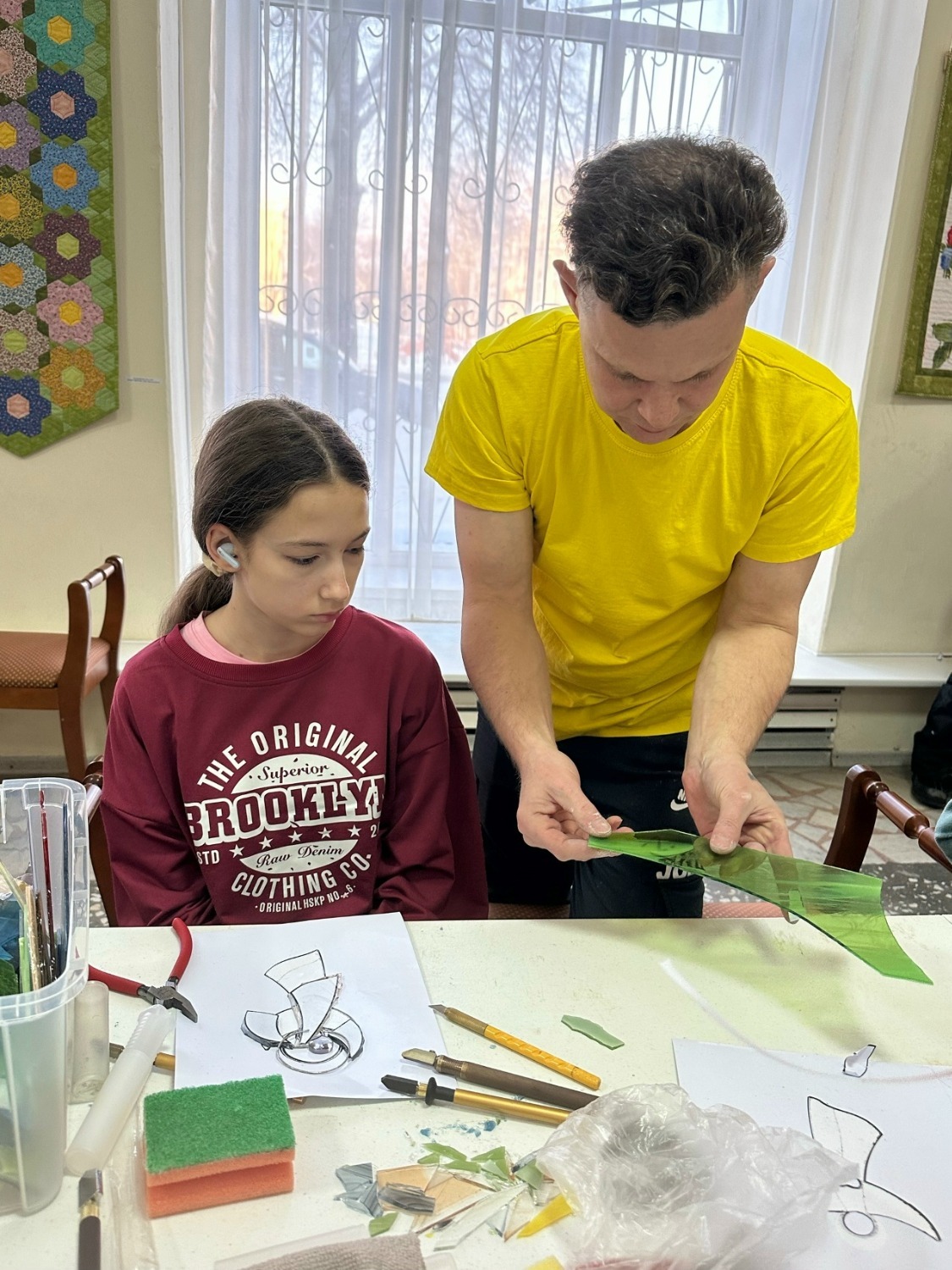 Что делали наши гости? Взрослые и дети изучили технику «Тиффани». Самостоятельно выбирали уникальный образ и цвет для своей фигурки, вырезали детали из цветного стекла, обернули их медной фольгой и даже самостоятельно паяли в единое целое!